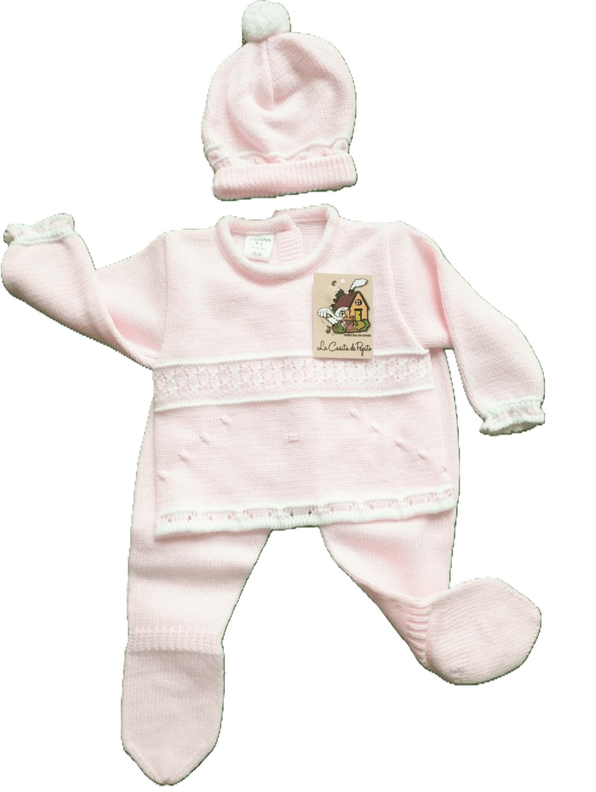 2711 Conjunto de bebé rosa. Tres piezas, gorro, jersey y polainas.