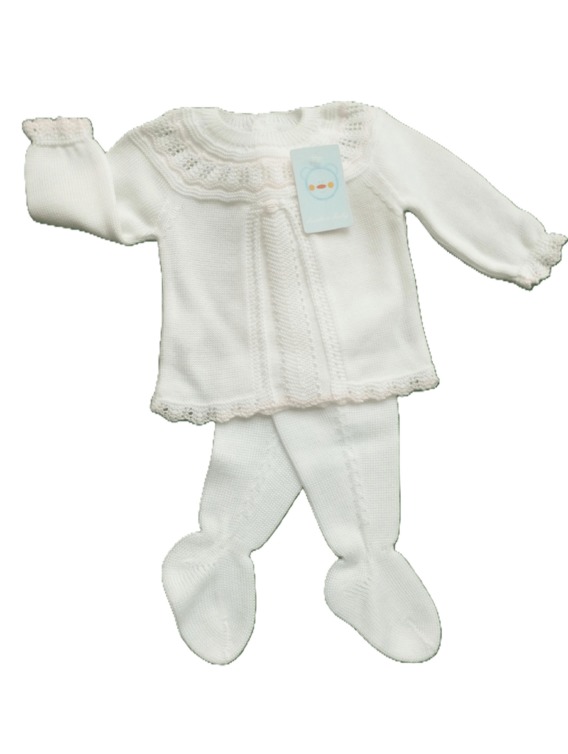 B4306A 2711 Conjunto de bebé blanco de lana. Dos piezas jersey y polainas.